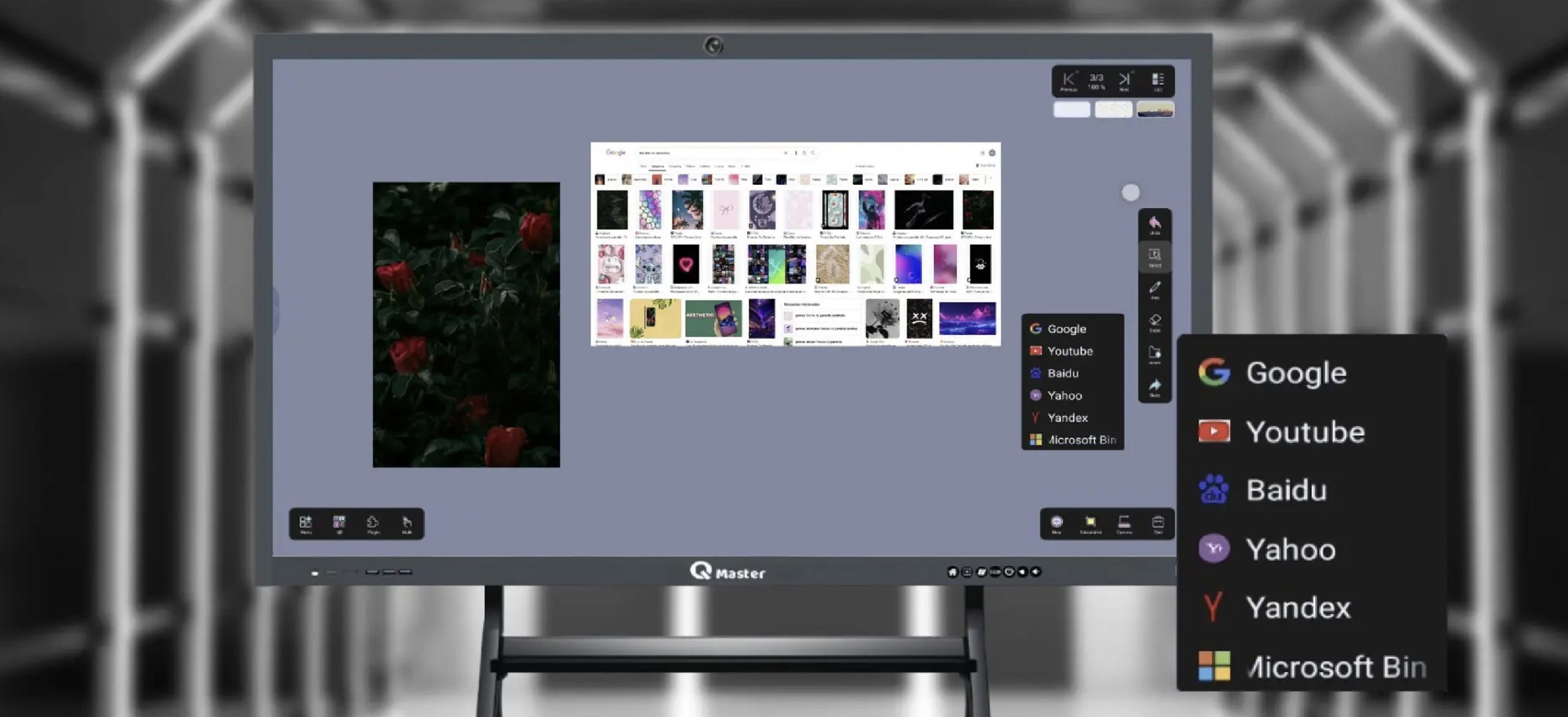 La pantalla incluye aplicaciones preinstaladas como pizarra interactiva y herramientas para visualizar imágenes y videos. Además, cuenta con una tienda virtual propia que permite descargar aplicaciones adicionales